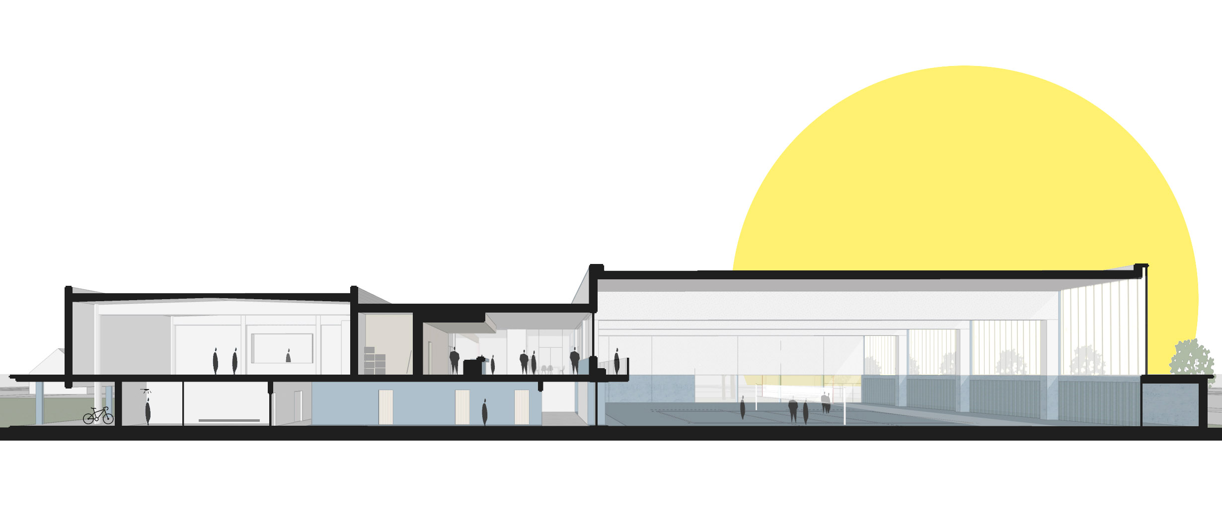 Als schakel tussen de drie sporthallen zien we de inkom, cafetaria en de bijgevraagde kleedkamers.